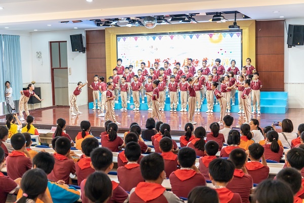 從“校園好聲音”決賽中選送的歌曲聯(lián)唱《數(shù)星星》《我愛老師的目光》《天空中最閃亮的星》,贏得了觀眾的熱烈掌聲。光榮退休的謝潔老師走上舞臺,在演員們的簇?fù)硐拢舆^肖志紅校長獻(xiàn)上的鮮花,全場響起熱烈的掌聲。