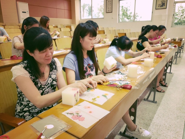 此次活動非常受老師們的喜愛,雍陌小學(xué)有27位教師參與了此次活動。晨光服務(wù)中心的鄭潔嵐社工先是細(xì)心地給教師們講有關(guān) “壓花”蠟燭的來歷、介紹,還通過圖片教大家如何去搭配和構(gòu)思,然后再耐心地演示給大家看如何把花草壓在白色的蠟燭上。在教師們親自動手感受壓花工藝過程中,鄭社工和她的兩個同伴非常認(rèn)真、耐心地給教師們一對一指導(dǎo)。整個過程持續(xù)了一個多小時,但雍陌小學(xué)的老師們都非常地專注于壓花,陶醉其中,完全忘記了一天的疲憊,也忘記了時間。