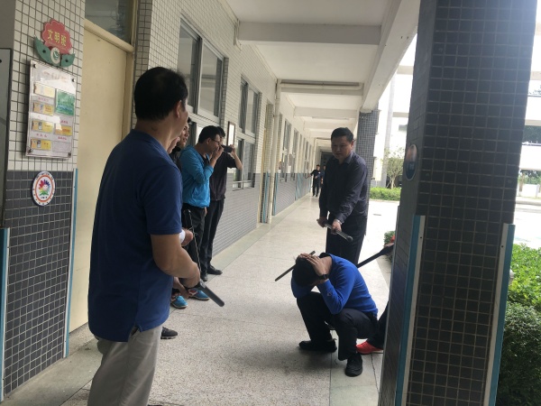 3月27日下午3點(diǎn),演練活動(dòng)正式開始。一名“不法分子”以約見老師為理由要求進(jìn)校園。學(xué)校保安要求其出示身份證等有關(guān)證件進(jìn)行登記,然而這名“不法分子”趁保安不注意時(shí)強(qiáng)行闖入校園。一名保安立刻上前制止,另外一名保安迅速按下一鍵報(bào)警器。全校師生聽到警報(bào)后立刻執(zhí)行“學(xué)校防暴應(yīng)急預(yù)案”。譚主任利用廣播告知師生“學(xué)校發(fā)生不法分子進(jìn)入校園”的通知。并且,學(xué)校護(hù)衛(wèi)隊(duì)16名隊(duì)員拿著警棍警戒,迅速分成4隊(duì),分別守住一樓4個(gè)樓梯口,防止不法分子沖入教學(xué)樓傷害學(xué)生。上課老師立即組織學(xué)生緊閉門窗,用課桌、木柜頂住門窗,防止不法分子破門窗而入。在室外上課的老師,指揮好學(xué)生緊急疏散到教室或安全地帶。