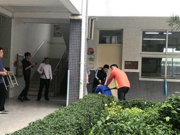 “不法分子”沖入校園,經(jīng)過(guò)大堂,徑直走向教學(xué)樓,企圖從靠左邊的樓梯上樓。看守在這個(gè)樓梯口的4名護(hù)衛(wèi)隊(duì)員立刻拿起器械制止“不法分子”,附近的護(hù)衛(wèi)隊(duì)員也跑過(guò)來(lái)支援。護(hù)衛(wèi)隊(duì)成員們迅速將“不法分子”制服,并由4名民警押回派出所。最后,譚主任用廣播宣布演練活動(dòng)結(jié)束,校園恢復(fù)正常秩序。