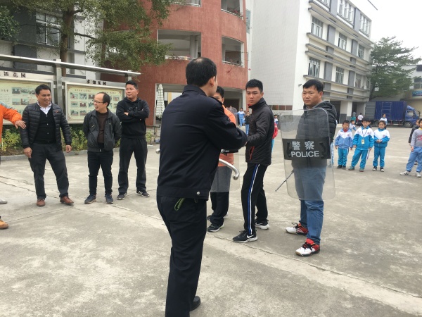 首先,由黃警官對全體護衛隊老師開展使用鋼叉、護盾的介紹及體驗。黃警官詳細介紹,護衛隊成員認真聆聽。大家三人為一小隊開展模擬抵擋危險人物的襲擊活動,兩人拿盾、一人抓鋼叉,制服危險人員。經過親身體驗,護衛隊成員切實掌握了保護自我、使用防衛工具的方法。