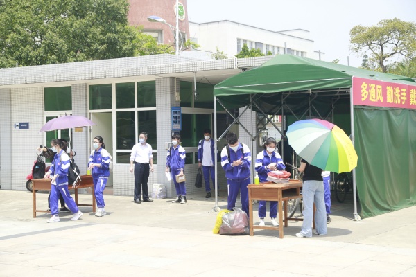 根據上級指引,博愛中學初三學生從中午12:20開始,實行分五批次錯峰返校。中午12:20,值日教師組織學生在校門口排隊,保持1米的間隔距離,依次有序進入體溫檢測通道。在測溫區,值日教師在通道兩側通過紅外測溫儀和手持測溫儀對學生逐個進行體溫檢測,體溫正常的學生使用免洗洗手液清潔手部后進入校園。學生進校后按照指定路線回到相應班級。由班主任再次測量體溫,方可進入課室。