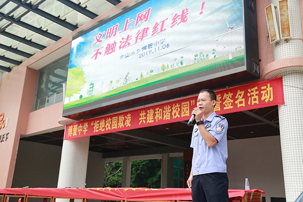 2019年11月11日,中山市博愛初級中學舉辦了以“拒絕校園欺凌,共建和諧校園”為主題的全體師生簽名活動。此活動意在加強學生的法制意識,防止校園欺凌事件的發(fā)生,營造平安、和諧的校園氛圍。