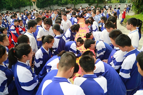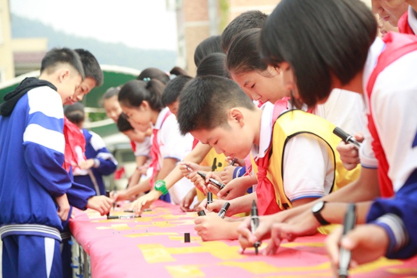 活動中,全體同學進行宣誓,并在印有“弘揚校園正能量,向校園欺凌說不”、“網(wǎng)絡素養(yǎng)記于心,安全網(wǎng)絡踐于行”和“增強法制觀念,拒絕校園暴力”的橫幅上簽名,承諾從自己做起,拒絕校園欺凌。從同學們莊嚴的宣誓簽名中看到他們的決心,相信他們一定會謹守自己的言行,關(guān)心、愛護、尊重每一位同學。