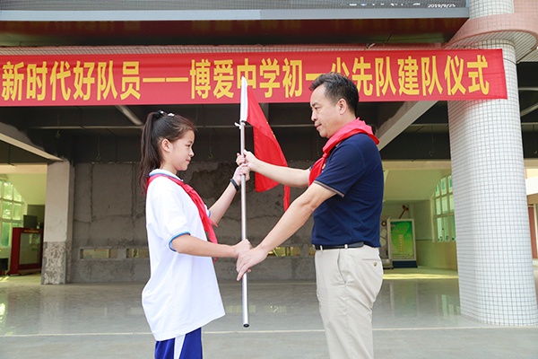 2019年9月26日,為引導隊員們繼承和弘揚少先隊的光榮傳統,增強少先隊員的光榮感和自豪感,培養少先隊員的民族自豪感和愛國、愛隊之情,展現新一代少先隊員的風貌,激勵、教育全體少先隊員聽黨的話,愛祖國,愛人民,愛學習,做共產主義事業的接班人。博愛中學組織舉行了以“傳承星星之火 爭做新時代好隊員”為主題的初一少先隊建隊儀式。
