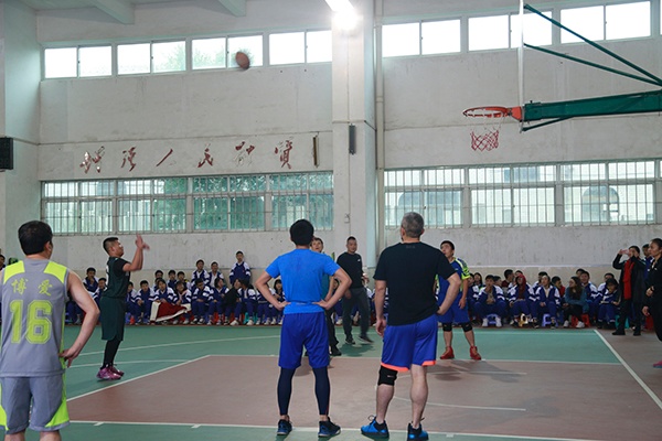 下午3:50,全級學生都集中到籃球場邊,球員們已經到場做著準備活動。隨著裁判的哨響,整個球場就充滿了緊張的氣氛,球員的激情全都淋漓盡致的體現在籃球場上。比賽中,教師隊員全力以赴,用心防守、有力阻擋,越戰越勇,顯示了他們極佳的心理素質。場外的同學也情緒高漲、搖旗吶喊,不時為隊員打氣、喝彩,氣氛熱烈。賽場上的,雙方拼搶很激烈,帶球、運球、投籃等一系列動作瀟灑、規范,引來圍觀同學一陣陣地喝彩。比賽緊張而激烈地進行,雙方比分一度接近,學生隊也毫不氣餒,在比賽的最后階段,場面異常火爆。學生隊隊員都用心跑位,為隊友作掩護,還時不時有精妙的傳球、漂亮的配合和精彩地上籃。緊張激烈、扣人心弦的角逐,不斷的在籃球內上演,場外的啦啦隊同學也饒有興致地觀看著比賽,為參與比賽的教師、同學打氣、喝彩,與場內的氣氛融為一體!最終教師隊多三分贏得勝利。