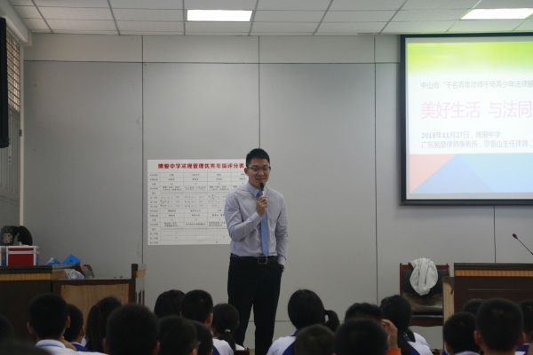 11月27日下午,中山市“千名青年律師千場青少年法律服務活動”在三鄉鎮博愛中學舉行。廣東憲鼎律師事務所羅景山律師給初一級的學生帶來了一堂生動的預防未成年人犯罪的法制教育課。