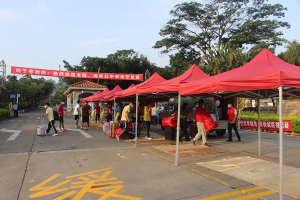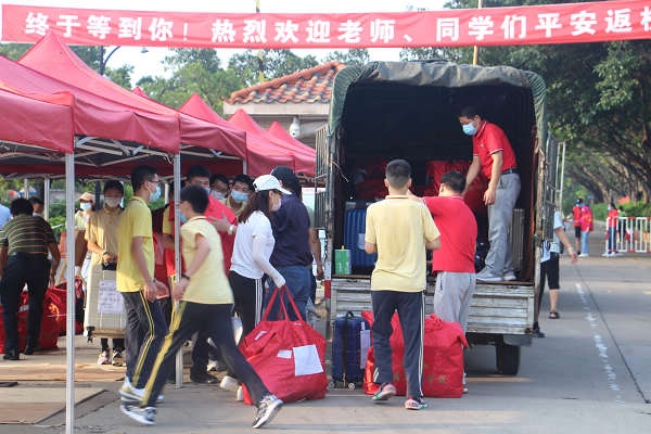 第二批返校復(fù)課學(xué)生三千余人,全部按計劃分批錯峰返校。初中兩個年級分上下午在學(xué)校正門、西門、側(cè)門、后門四個入口分班錯峰返校。每一個班級學(xué)生所對應(yīng)的返校通道、返校時間段及其他各項(xiàng)要求已提前通過給家長發(fā)布的《告家長書》逐一傳達(dá)到每一位學(xué)生及其家長,真正做到錯峰、分時、分散返校。為了讓家長無后顧之憂,將學(xué)生送到校門口立刻安心離校,學(xué)校還組織了部分管理人員、初中教師、生活老師、后勤人員以及部分學(xué)生作為志愿者,在各個入口幫助返校學(xué)生卸行李、搬行李,引導(dǎo)學(xué)生檢測體溫等,完成好學(xué)生平安復(fù)課的每一道安全關(guān)卡。
