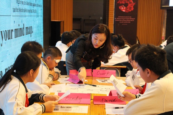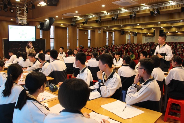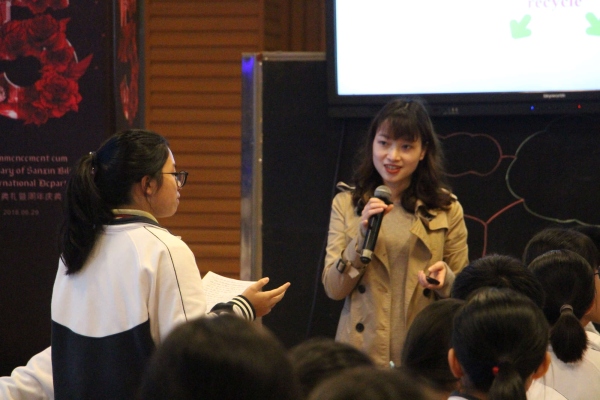 下午初中的培訓活動是由三鑫副校長、初中部校長、省特級教師宋春燕主持,三鑫初中部英語科組王喜愛老師執教九年級閱讀課《We’re trying to save the earth》,配合展示的是三鑫九年級11班的同學們。王老師用一口令人稱羨的流利口語與同學們共同探討了“如何拯救我們的地球”這一閱讀話題。課堂上,同學們還用英語展示了自己對于廢物再利用的想法,內容充實,互動性強。