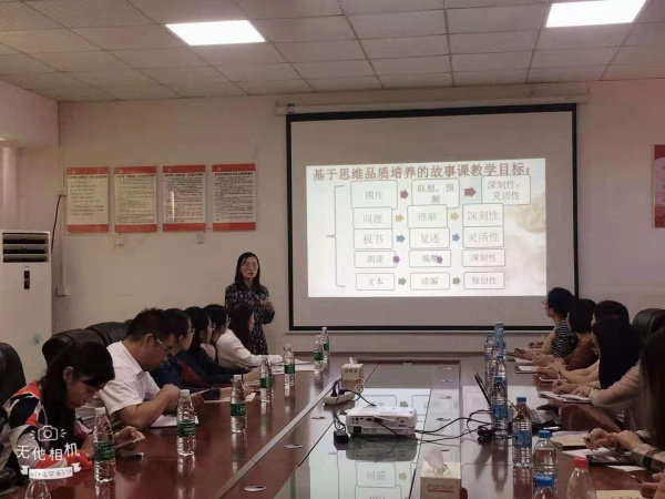 展示課結束后,大家移步學校會議廳,駱倩盈老師向大家呈現了一節題為“以英語故事教學為載體的英語思維培養”的高水平說課。說課中駱老師深入闡述故事教學中如何實現學生思維的深刻性、靈活性和創新性的培養,思路清晰、環環相扣,理論和實踐充分結合,教學設計科學高效,為老師們示范了一節經典的說課課例。