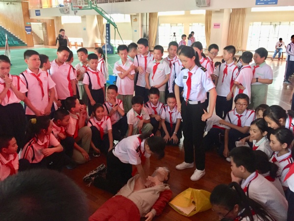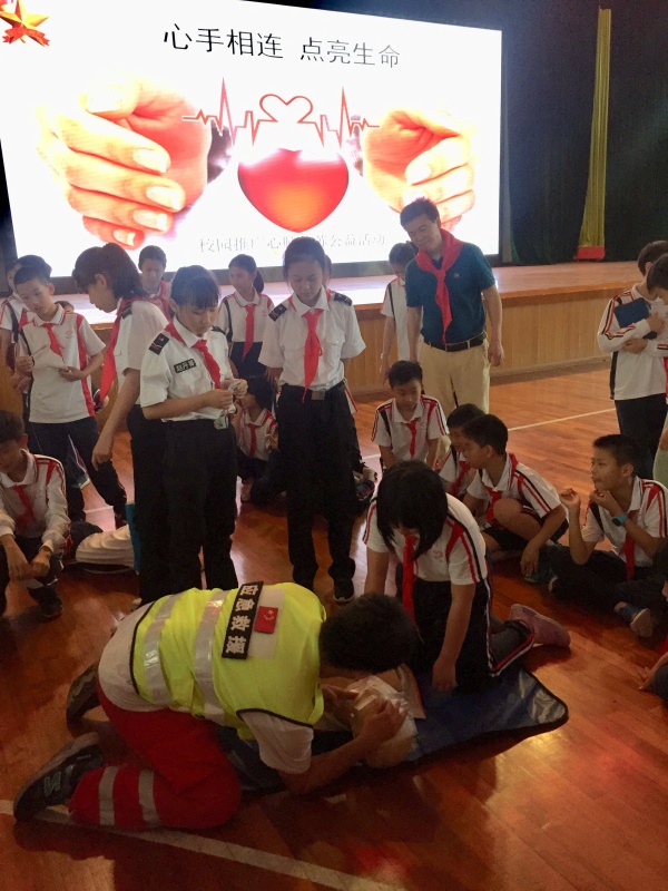 中山市紅十字會高老師結(jié)合具體案例,帶著隊員們認識了心臟驟停的危害,還給大家深入淺出地講解了心肺復(fù)蘇的原理、要領(lǐng)和作用,并教隊員們?nèi)绾卧谝馔猬F(xiàn)場啟動救護“生命鏈”。