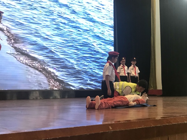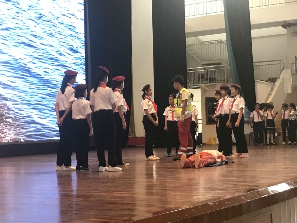 光后醫(yī)療輔助隊與校外輔導員馮子杰老師,為大家獻上了一場極具教育意義的情景劇《海灘急救》。配合背景視頻、故事講述,以及輔助隊隊員們的協(xié)作,展現(xiàn)出光后醫(yī)療輔助隊的專業(yè)精神與認真態(tài)度。