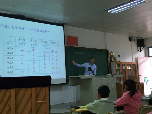 本次活動先由夏傳霞老師執教《田忌賽馬》第一課時,借助故事情境完美地解決了4個問題:①理解最佳策略是什么②最佳策略是怎么找出來的,感悟優化思想③學習對策問題的意義——絕不僅僅是掌握“對方先出、以弱勝強”這個最佳策略,更應培養尋找最佳策略的優化意識。④避免2個思維定勢:對策問題不只是田忌賽馬的以弱勝強,最佳策略也不一定就是唯一的——拍球比賽從三局兩勝到四局三勝,成功打破學生的思維定勢。