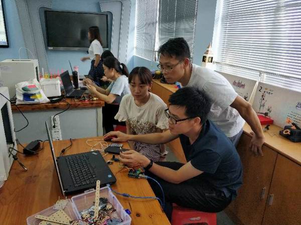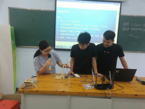 培訓的第一天上午,區教育發展中心裝備與信息化室蔡海輝老師主持簡單的開班儀式,對培訓目標、培訓課程設計、導師團隊和學員參訓要求等進行了介紹,隨后,德勝學校梁錦明老師毫無保留地分享見解獨到的創客教育理念,結合自身專業成長經歷,分享草根平民化創客教育之路,并對區第三屆創客節創客現場挑戰賽的比賽規則進行詳細的解讀。下午和第二天上午,由講師團的培訓講師帶著老師們認識常用的開源硬件電子模塊及其應用項目搭建。在講師和助教們的耐心引領和指導下,老師們掌握了常用電子模塊的電路搭建和編程。