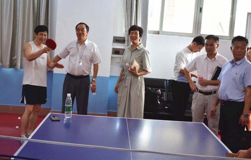 領導高度贊賞乒乓球室裝潢贊助者楊軍先生(左一)支持教育的善舉。
