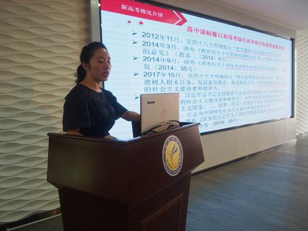 接著由區初中英語教研員杜曉曦老師解讀了新學期區英語學科工作要點;再由區高中英語教研員許莎莎老師分析了新高考背景下的英語教學,許老師提出,要提高學生聽力能力,口語能力及閱讀能力,要遵循新課改理念,培養學生綜合素質和能力,促進學生英語應用能力的全面發展。
