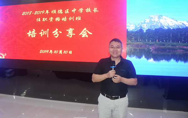 在分享會上,順德區教育局冼彌冬副局長和廣二師網絡教育學院賈匯亮院長給學員做了指導性發言。冼彌冬副局長以順德現任的一些高中優秀校長為例子,指出做一名好校長必須是苦干和巧干相結合;賈匯亮院長也指出要成為一名新時代的優秀校長,必須走學習研究之路。