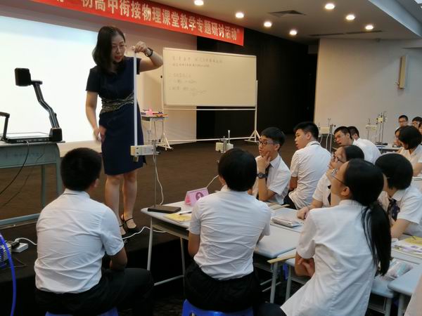 活動以兩節非常精彩的初高銜接示范課拉開帷幕。廣東順德德勝學校楊元老師執教的初中物理課――《串、并聯電路》,課堂設計以問題驅動,層層推進,利用演示實驗和學生實驗幫助學生認識串、并聯電路之間的聯系與區別,聯系生活實際,激發學生求知欲。