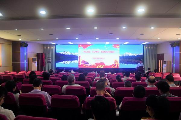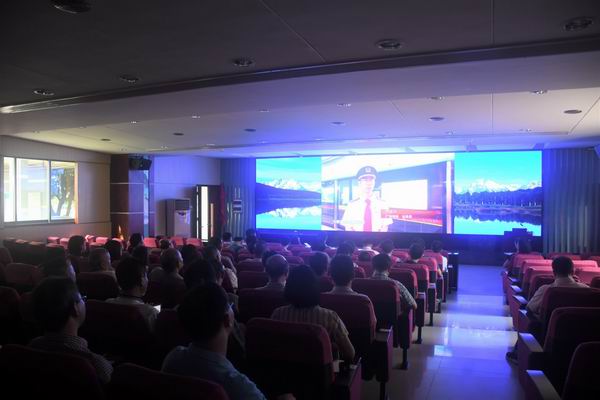 會議的第三項議程,全體教職工觀看“不忘初心、牢記使命”主題教育先進事跡報告會電視錄像片。