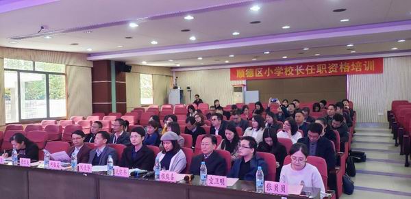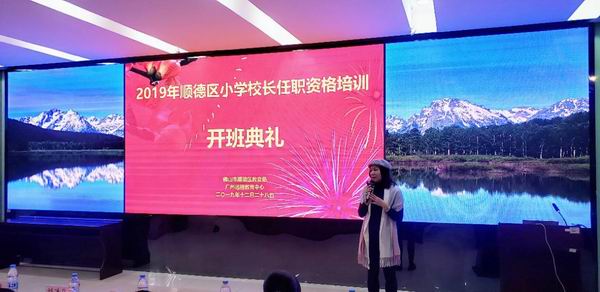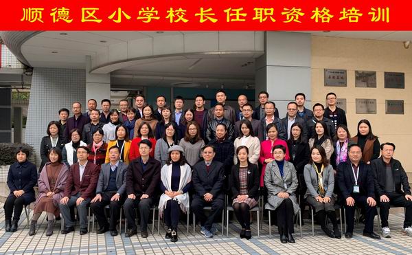 2018 年12月28日上午, 順德區小學校長任職資格培訓班在順德區教育發展中心B座一樓報告廳首次集中培訓。廣州遠程教育中心程庭喜教授、順德區教育局冼彌冬副局長、順德區教育局組織人事科劉進華科長等領導和嘉賓出席了開班典禮,全區45名小學校長參加本次培訓。