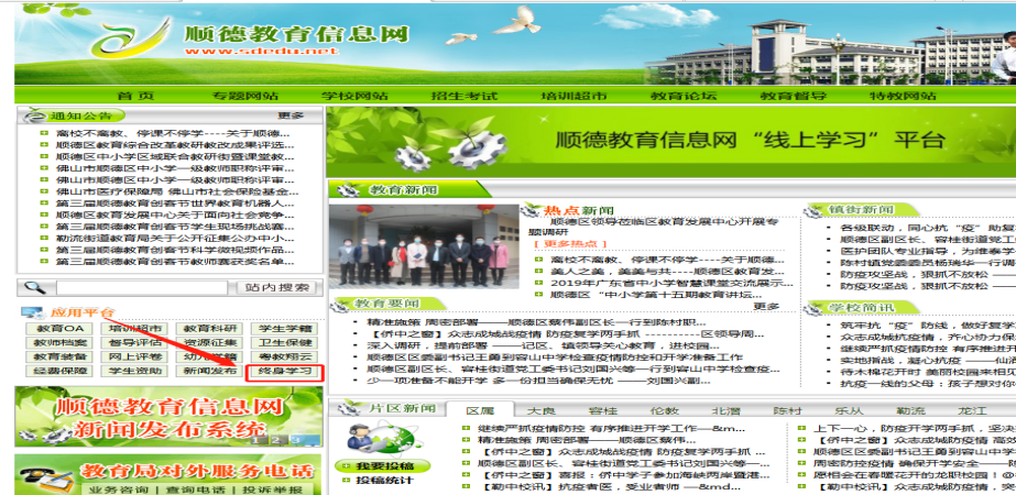 “順德終身學習平臺”在“順德教育信息網”首頁“應用平臺”已添加鏈接。各位學員可通過“順德教育信息網”進入學習。學習平臺聯系人:李健新,電話22328588,18923233998。