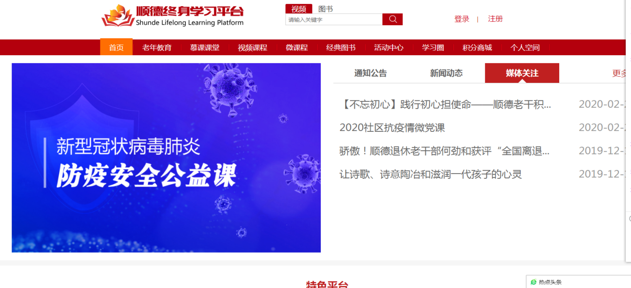 為滿足廣大社區群眾的學習需求,實現我區社區教育信息化、數字化建設目標,在順德區社區教育工作指導委員會指導下,順德社區學院充分發揮“全民學習、處處能學、時時可學”“互聯網+終身教育”遠程開放教育新模式的優勢,組織開發全區最大公益性學習平臺――“順德終身學習平臺”。該平臺于2019年11月2日在順德區全民終身學習活動周啟動儀式上正式發布,經過反復測試和資源的持續充實,近日開始運行,PC端與“學習通”APP同步上線,廣大市民將實現不出家門就可享用豐富社區教育資源。