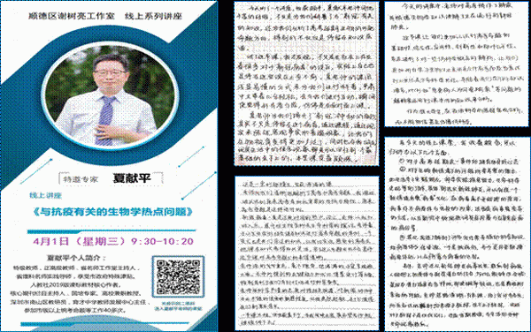 師生組織線上教學與學習是對抗疫情的有力手段,“病毒與疫情”是一個很好的教育契機,為此順德區(qū)謝樹亮特級教師工作室組織開展了“線上系列講座”,特邀夏獻平老師做了《與抗疫有關(guān)的生物學熱點問題》專題講座,夏老師是特級教師、正高級教師、省名師工作室主持人,享受深圳市政府特殊津貼,夏老師豐富的專業(yè)知識,結(jié)合當前的疫情熱點,圖文并茂地給四百余位師生講解了“新冠病毒”中的生物學知識,線上收聽講座的工作室成員和學生感受很深,師生們用文字記錄了自己聽講座的感受。