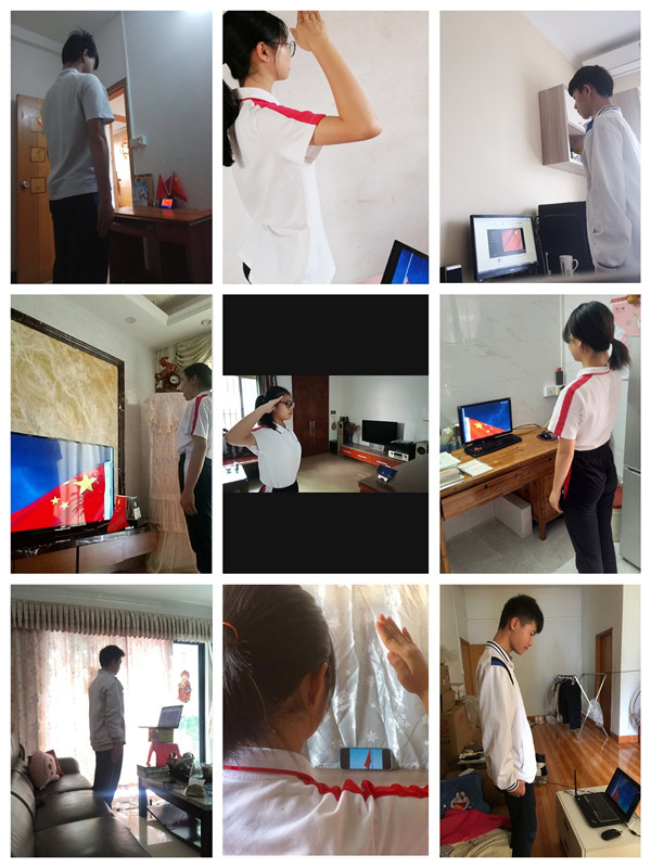 隨著國歌響起,鮮艷的五星紅旗冉冉升起,學校全體行政在學校,全體同學在家中整齊肅立,注視著國旗,唱響國歌。這是一場特殊的升旗儀式,更是一場特別的“開學典禮”。