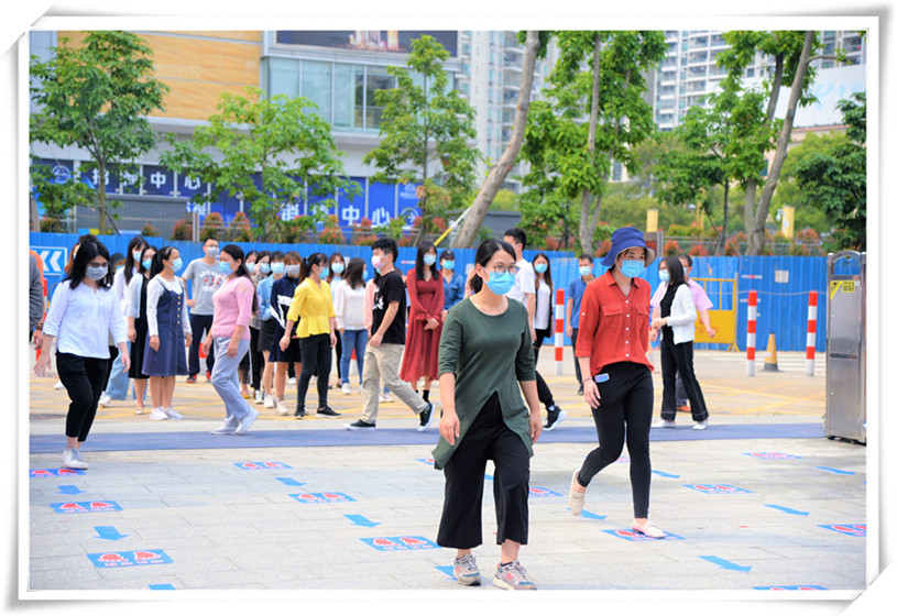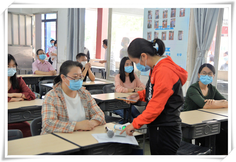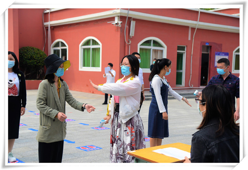 12名工作人員對學生進行體溫檢測登記,并按照學號引導其按照指定路線有序進入教室。