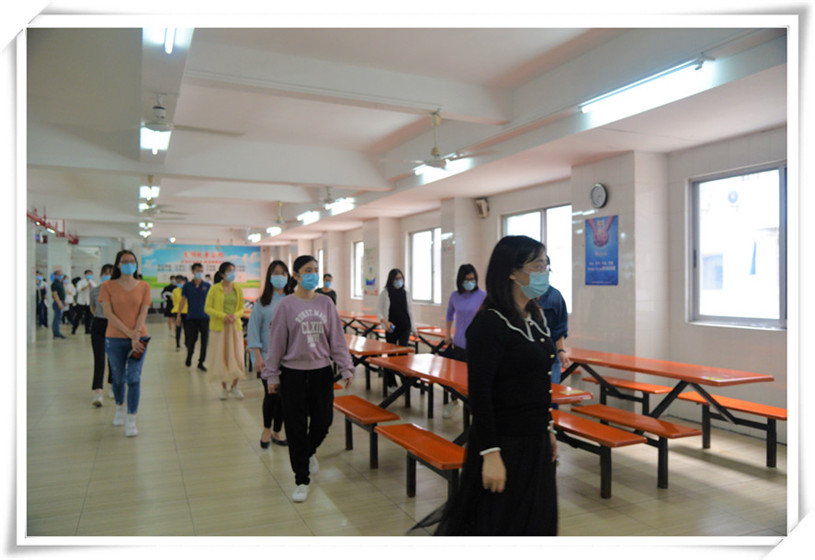 就餐之前,生活老師以及安保人員提前到場,有效組織學生文明就餐。隨堂老師帶領學生以間隔1.5米的距離前往飯堂,按照七步洗手法進行手部衛生消毒后,進入飯堂模擬打飯。所有同學就座后,采用“錯時同向減半原則”就餐。就餐結束后,學生按照指定路線離開飯堂。