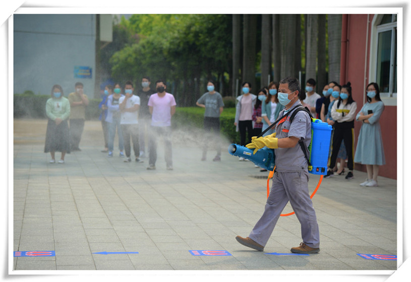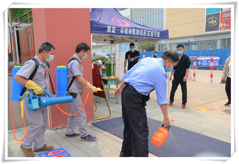 開學當日,學校正門處50名學生(教職工扮演)在指定區域間隔1.5米以上距離排隊候檢。保安人員在前門地毯噴灑足量的消毒液,在檢查學生口罩正確佩戴后放行。