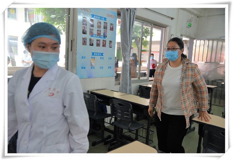 九(1)班教室內,25名學生有序坐在座位上,等待放學午檢。楊懿老師測溫時發現劉同學經過二測測溫后體溫值仍為38.2℃,立即禁止室內人員走動,并分別致電梁醫生、落級行政彭渭榮副主任和班主任帥瑩老師。在校醫處理突發情況時,楊懿老師帶領所有學生前往備用教室繼續進行體溫監測并記錄。
