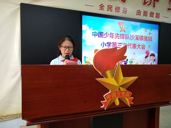 大會在激昂的國歌聲中拉開序幕。首先是五(2)中隊王璽覃隊員、劉韶萱隊員代表向大會獻詞,精彩激昂的獻詞激勵著每一位少先隊員“為共產主義事業而奮斗”的決心,號召大家用知識做鎧甲,用信念搭建理想之橋,做一個有理想、有道德、有文化的社會主義接班人。隨即是圣獅小學少工委副主任李春蘭主任向大會致辭,李主任對大會的勝利召開表示熱烈祝賀,同時也表達了對少先隊員成長的期盼和祝福。