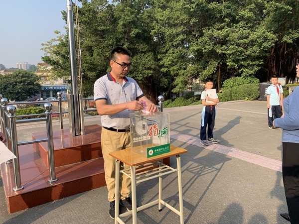 儀式開始,學校少工委總輔導員伍煜獻老師宣讀“12?8”慈善捐款倡議書,他向全校師生發出倡議,號召全校師生弘揚樂善好施、崇文重教的傳統美德,慷慨解囊,為沙溪教育事業的發展齊齊出力,積極響應沙溪鎮12?8慈善活動,以實際行動回報社會,獻出自己的愛心。緊接著,伴隨著優美的樂曲,黃賢軍校長帶領全體教師進行了捐款,他們走向捐款箱,把各自善款放入捐款箱中,獻出了自己的一份愛心。頓時愛心涌動,一份份愛心匯聚成愛的海洋,一個個愛的音符彈奏成一曲曲動人的愛心曲,在整個校園飛揚開去。最后,黃賢軍校長滿懷深情地進行了總結,他高度贊揚了全體老師積極參與,踴躍捐款,奉獻愛心的精神,希望各班同學也要積極獻出自己的愛心,認真籌備下周的體育慈善文化節系列活動,為沙溪的教育事業出一份力量。