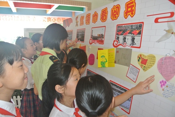 之后進行了觀看閱兵感受的分享,“看了閱兵式,我感受到了中國的強大,我非常驚訝,我們中國是一頭雄獅,而且是已經睡醒的雄獅。中國科技越來越強大了,讓人民更加安心了。中國,加油!”、“祖國!我為您驕傲!當我對別人說起我是中國人的時候,我感到無比自豪。”、“我感到非常驕傲,非常自豪!長大以后,我要好好學習,成為祖國的棟梁,報答祖國!”……各隊員代表滿懷激情地逐一分享了觀看閱兵后的感受,大家都深切地感受到新中國的日新月異,繁榮富強。大隊委還把優秀的感言卡片張貼在“紅領巾看顧閱兵”專欄上與隊員們分享。隨后,全體師生在校合唱隊的帶領下一起唱響了《我和我的祖國》,把現場氣氛推上了高潮。隊員們激情澎湃地用最美的歌聲祝福祖國,展示了新時代少先隊員熱愛祖國、心懷感恩、奮發向上的愛國情懷,也向中國少年先鋒隊建隊70周年獻禮。