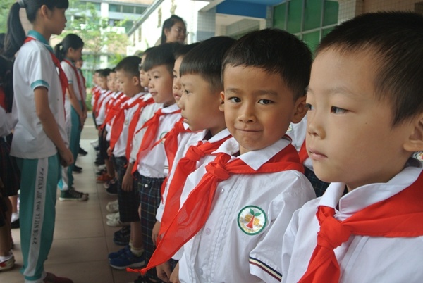 八時許,在進行曲中,各中隊少先隊員們邁著整齊的步伐來到升旗臺前,一年級的小朋友也整整齊齊地排列著。升旗儀式結束后,出隊旗、奏隊樂,唱隊歌,大隊長宣讀組建一年級少先隊組織的決定,宣布新隊員名單。隨后,在《紅領巾相約中國夢》的歌聲中,六年級的少先隊員們為一年級新隊員佩戴上鮮艷的紅領巾。沙溪鎮中心小學校長、少工委主任黃賢軍為新成立的4個中隊授旗。新隊員們在紅領巾的映襯下,個個神采奕奕,在隊旗下跟著大隊長進行莊嚴宣誓。