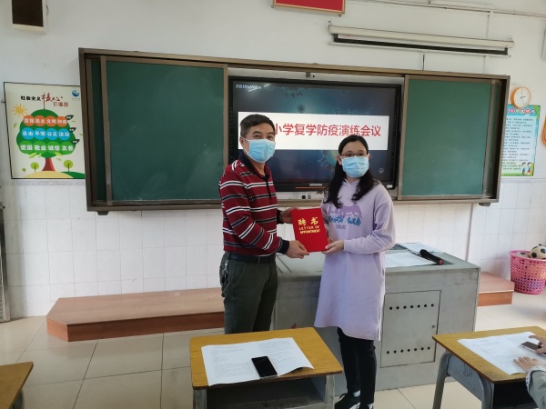 為更好地開展返校復課疫情防控演練,學校根據上級部門的要求詳細制定了演練方案,并根據演練方案準備好演練物資,于4月14日下午2點召開全校員工專題演練安排會議。會議開始前,劉奧鵬校長先向全體教師員工介紹了學校的陳綠清健康衛生副校長,并頒發了聘書。隨后,劉奧鵬校長對演練進行了總體安排,提出了明確要求,使每一位參與人員熟悉流程、明確職責,確保每一個環節有序進行,為演練的順利開展奠定了基礎。