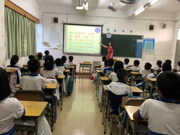 此次活動共有四個環(huán)節(jié):認(rèn)識毒品、毒品危害、如何遠(yuǎn)離毒品和小小禁毒宣傳員。首先,各班班主任向同學(xué)們展示各種各樣的毒品圖片,提醒同學(xué)們要時刻警惕新型毒品,因為犯罪分子無孔不入。同學(xué)們自身一定要學(xué)會辨別毒品,遠(yuǎn)離和拒接毒品。接著,班主任再告誡同學(xué)們,毒品不僅使人身體消瘦、精神不振、抵抗力下降,還會誘發(fā)各種犯罪行為,給自身、家庭造成無盡的傷害,嚴(yán)重威脅社會的安定,所以一定要遠(yuǎn)離毒品。然后,老師拋出問題:毒品無處不在,那同學(xué)們應(yīng)該怎么遠(yuǎn)離它呢?同學(xué)們暢所欲言,有的說不去網(wǎng)吧、舞廳、游戲機(jī)房等不良娛樂場所;有的說不接陌生人的東西,不吃陌生人的東西……活動最后,每個同學(xué)化身小小禁毒宣傳員,和家人一起制作禁毒宣傳小旗幟或禁毒宣傳海報,向小區(qū)、社區(qū)、街道人員進(jìn)行禁毒宣傳。大家攜起手來,舉起旗幟,遠(yuǎn)離毒品,珍愛生命。