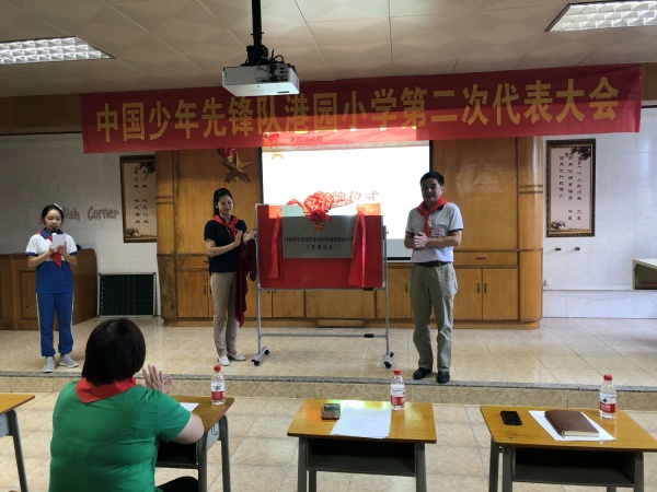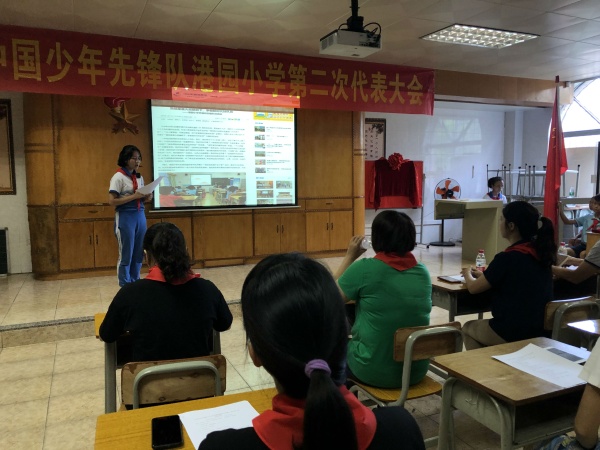 6月17日下午,陽光明媚,港園小學的少先隊員們格外興奮,因為中國少年先鋒隊中山市沙溪鎮港園小學大隊第二次代表大會暨少工委成立儀式在電教室正式舉行。沙溪鎮少工委總輔導員阮秀迎、港園村關工委主任黃麗端、港園小學黨支部書記劉奧鵬、教導主任胡綺紅、辦公室主任李嘉政、輔導員彭思劬以及中隊輔導員代表、各中隊少先隊員代表等參加了會議。