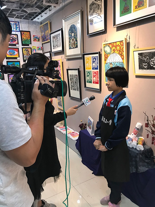 版畫教學對于目前的美術課堂教學還是比較冷門,很多人不了解版畫的制作原理和意義。通過這次展示活動,讓更多的人親身接觸到版畫,感受到它的魅力所在。尤其是學校根據本土特色文化進行版畫教學,制作了一系列關于隆都文化的版畫作品,比如沙溪人人皆知的“開門大吉”,學生從繪稿-轉稿-刻制-印刷等過程呈現一幅幅精美的“開門大吉”,甚至用“開門大吉”手工制作了可愛精美的鑰匙扣,引來了很多詢問價格的人。除了印制“開門大吉”,學校還利用隆都文化主題的版畫作品與沙溪的服飾相結合,印制了一批獨一無二的衣服和手提包包。由于版畫作品呈現的獨特效果和現場熱鬧的氛圍,把沙溪鎮電視臺也吸引過來了。濠涌小學六年級少先隊員胡樂宜大方地接受采訪,把學校的版印特色和制作版畫帶來的樂趣娓娓道來。