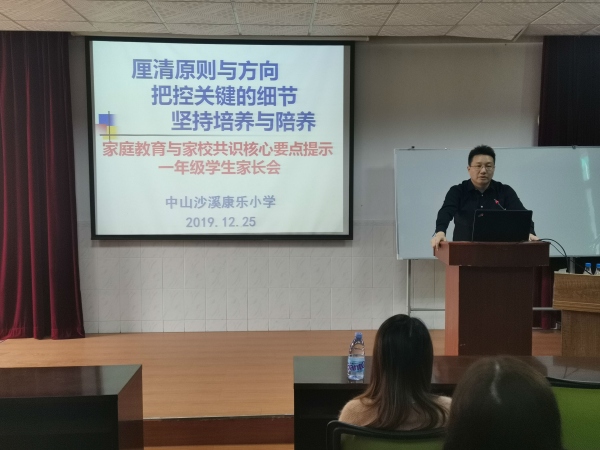 以“家庭教育與家校共識核心要點提示”為主的一年級系列家長培訓活動是沙溪鎮康樂小學一直堅持的常規管理項目之一。主要目的是讓家長們系統了解學校基本概況、特色亮點、辦學理念、核心方向和常規活動,了解學生在學校的基本活動流程,了解學校教育與家庭教育形成合力的基礎與要求。沙溪鎮康樂小學于2019年12月25日下午舉行了主題為“厘清原則與方向,把控關鍵細節,堅持培養與陪養——家庭教育與家校共識核心要點提示”一年級新生家長會,培訓由康樂小學吳偉標校長主講,分兩個方面的主要內容而展開。