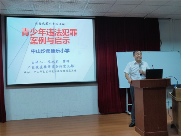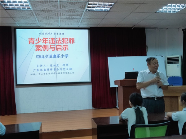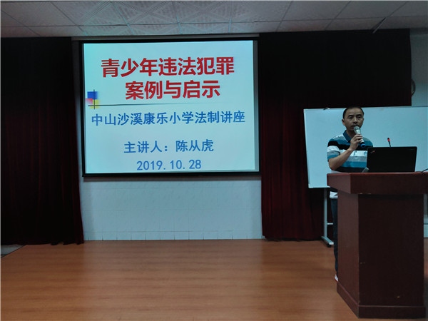 為有效預(yù)防和減少青少年違法犯罪,增強學(xué)生法律觀念,11月7日下午,中山市沙溪鎮(zhèn)康樂小學(xué)在學(xué)校報告廳舉行法制專題講座,邀請了廣東悅贏律師事務(wù)所知名律師陳從虎主講。講座由康樂小學(xué)德育主任沈光元主持,康樂小學(xué)六年級的全體師生聆聽了這次講座。