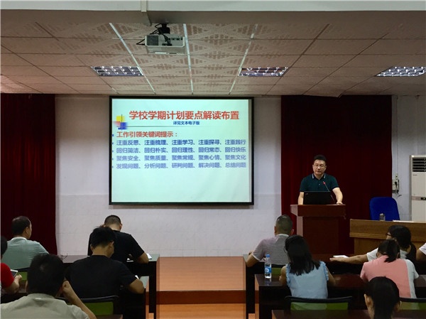 下午由各部門負責人分別進行專項布置與提示。先由程玉林副校長就教學部門工作布置,分別從教師調整、課程安排、本學期教研工作重點等方面進行解讀、解釋和安排,特別是在學生讀書工程和課堂教學研究提出,在方向上與學校康樂文化理念一致,在行動上要結合學科特點和自身特長,研究出行之有效的組織與評價策略;接著是汪海主任針對安全和后勤工作進行具體安排,強調安全教育要融入到平時教學或學生活動之中,懂得生活處處皆是安全教育素材的策略。