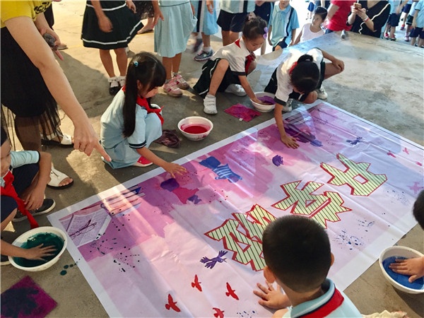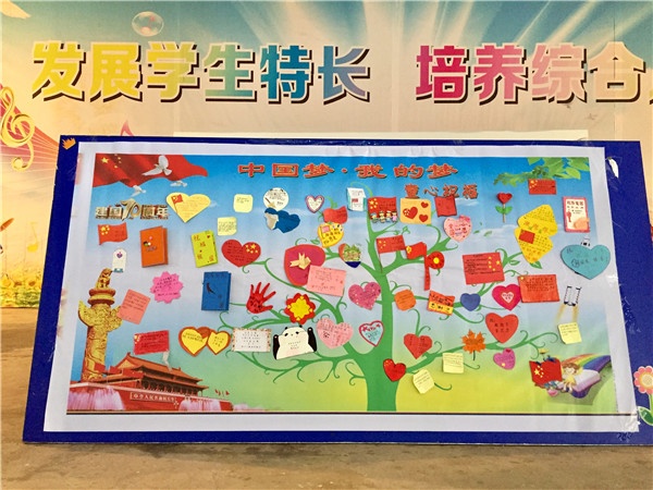 最后環(huán)節(jié)是學生祝福祖國的活動,在《我和我的祖國》為背景音樂的氛圍中,先由李梓浩和關子鈞同學為代表,朗誦《我驕傲!我是中國人》,在兩位同學精彩演繹中全體學生精神肅穆,仿佛告訴自己要用實際行動為祖國獻禮祝福;接著是給六年級學生頒發(fā)綜合成績優(yōu)秀獎,給祝福祖國注入實際行動的力量;最后是童心獻祝福活動:一二年級的各班派5名學生代表在畫布上用小手印印下心中最美好的祝福,三至六年級的學生代表把自制卡片貼在心愿樹上,燃起學生的同一夢想為實現(xiàn)偉大復興的中國夢而奮斗。
