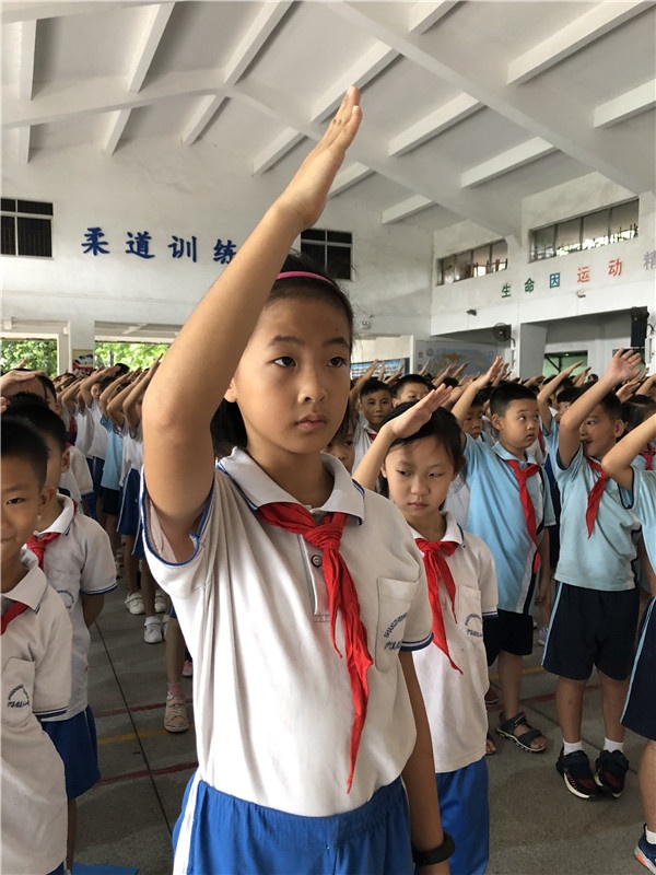 第二環(huán)節(jié)是莊嚴的升旗禮。隨著少先隊隊歌的響起,升旗手們邁著整齊劃一的步伐走向升國旗的地方。其他同學則以班為單位站成整齊的隊列,精神抖擻,態(tài)度嚴肅認真,舉起小手敬禮。老師們也毫不例外,一如孩子們的莊嚴神情帶著鮮艷的紅領巾高舉右手敬禮。升旗手們站定做好升旗準備,國歌一起,升國旗,全體肅立,敬禮、歌唱國歌。