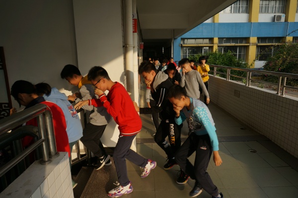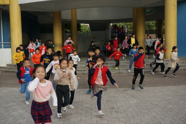 上午8點10分左右,一陣急促的警報聲響起,老師們迅速到達指定崗位,不斷提醒學生“不要慌”、“不要急”,各班同學在老師的指導下用濕毛巾等捂住口鼻,彎著腰,緊張而有序地按照指定路線撤離到安全區域。歷時不到2分鐘,全校師生全部安全地撤離到籃球場,各班主任清點人數后,向疏散組組長報告。疏散組組長將集合情況及時匯總后向黃金奇校長報告。
