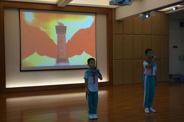 活動在莊嚴的隊儀式后正式開始。首先,主持人請各小隊的隊員上來分享他們在課下收集的關于毛澤東主席和周恩來總理的事跡,通過視頻、小品和詩朗誦的方式,隊員們了解了這些偉大的領袖人物的事跡,繼而在全體隊員心目中樹立起榜樣。隊員在活動中,還紛紛表示要向這些偉大的人物學習。接著,在了解了這些榜樣人物之后,隊員們還想到了,作為小小的少先隊員,沒有辦法像這些偉人和英雄一樣為祖國做貢獻,但是可以從自己做起,從身邊的小事做起,愛祖國,愛人民。于是,隊員們利用課余時間,排演了《當國歌響起時》和《撿起國旗》兩個小品,告訴隊員們如何尊重我們的國歌和國旗?隊員們深受啟發(fā),明白了這些身邊的小事都是我們隊員日常生活中可以做的愛國行為。接著,隊員們就在“小心心”貼紙上寫下了自己的愛國宣言,然后全體隊員把這些愛國宣言貼到了中國版圖的展板上,把內在的愛國之情用實際的行動展示出來。