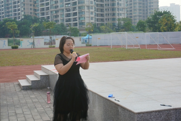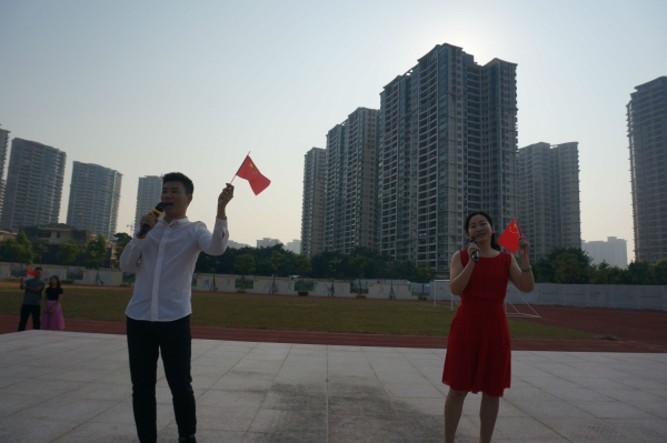 八點十分,禮贊國慶活動正式開始。隨著悠揚而熟悉的《我和我的祖國》旋律響起,劉孜老師和施燕紅老師揮舞這小紅旗,走上臺,帶領全體師生一起跟著音樂唱起來,“我和我的祖國,一刻也不能分割,無論我走到哪里,都流出一首贊歌……”這動人的旋律激起了師生們心中的愛國之情,全體師生有節奏地揮舞著那一面神圣的小國旗,高聲唱著那催人奮進的祖國贊歌,將活動推向了高潮。愛國之音響徹在校園內,回蕩在每一位老師和學生的心里,大家用歌聲盡情抒發對黨和祖國的熱愛,為黨和祖國獻上最真切的祝福。