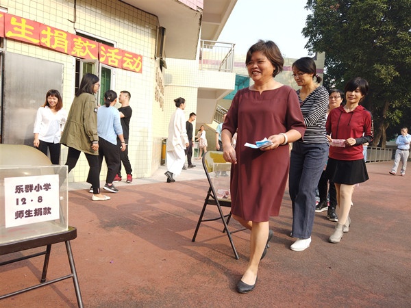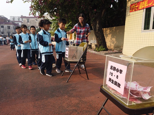 一年一度的沙溪鎮(zhèn)“12.8”慈善籌款活動已經(jīng)啟動了,今年的活動主題是“獻愛心,行善舉,為沙溪教育事業(yè)齊出力”,11月25 日,樂群小學極響應上級號召,利用廣播體操時間,開展了一年一度的“12.8”師生慈善籌款愛心捐款活動。