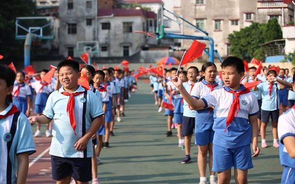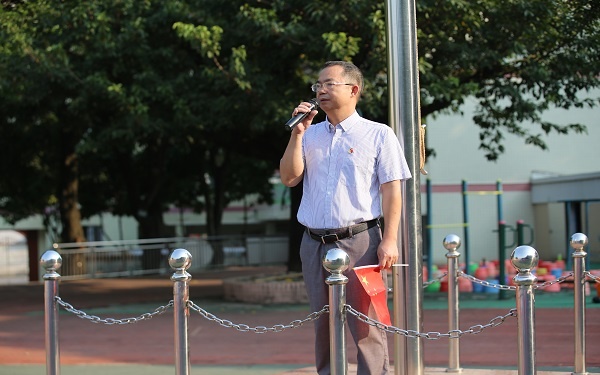 升旗儀式結束后,樂群小學楊明校長作國旗下講話。楊校長講述了祖國的發(fā)展歷程,如今的中國科技發(fā)展嶄露頭角,中國的GDP總量也居世界領先地位。這一切離不開黨中央的領導和決策,也離不開中國人民堅強不屈的奮斗。最后,楊校長激勵全體學生要以祖國的建設者和接班人的姿態(tài)展望未來,用實際行動為祖國增光添彩,努力學習,書寫新的輝煌。緊接著,在羅春霞老師和鐘文雯老師的指揮下,師生進行愛國歌曲聯(lián)唱。老師與學生排成整齊的方正隊形,在紅色經(jīng)典歌曲《我和我的祖國》與《歌唱祖國》的動人旋律中,學生揮舞著紅旗深情跟唱,唱出了對祖國母親的無限熱愛、對祖國華誕的深厚祝福。